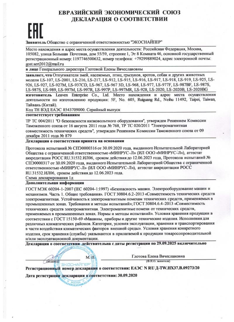 Универсальный ультразвуковой отпугиватель премиум-класса - «ЭкоСнайпер LS-968»